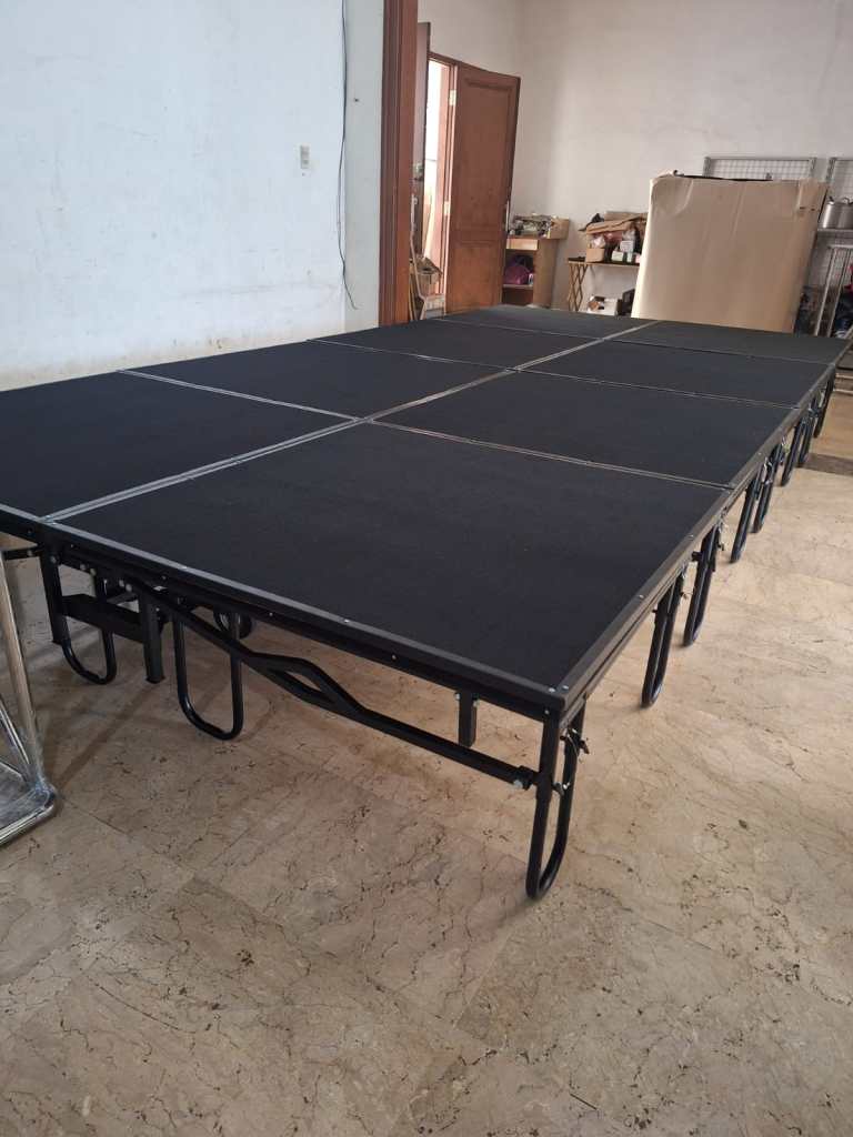 Panggung modular biasanya hadir dalam ukuran standar (misal: 1,2m x 2,4m), namun Anda perlu memastikan apakah tinggi panggung bisa disesuaikan. Beberapa produk menawarkan tinggi yang bisa diatur, misalnya 40 cm dan 60 cm