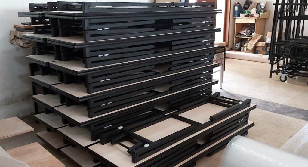 Keunggulan utama dari meja lipat adalah efisiensi ruang penyimpanan. Setelah digunakan, meja dapat dilipat dan disusun secara vertikal atau horizontal di ruang penyimpanan khusus. Hal ini sangat penting bagi hotel yang sering mengadakan acara dengan kapasitas besar, karena kebutuhan akan ruang penyimpanan yang rapi dan terorganisir menjadi prioritas utama. Meja lipat juga tersedia dalam berbagai bentuk seperti bulat, persegi, dan persegi panjang, sehingga dapat disesuaikan dengan kebutuhan jenis acara.